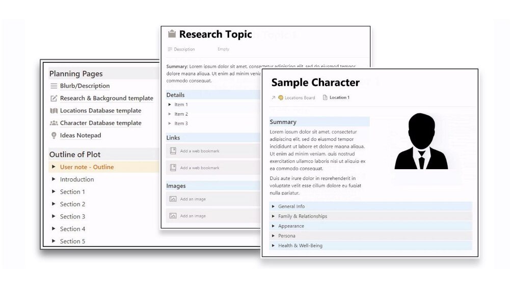 Outline Area: This set of toggles is a great way to map out the path you want the book to follow, one section or chapter at a time. Make notes, link to existing pages - either within Notion or elsewhere. And if you need more chapters or sections, just add more toggles! And there are notes on adapting the outline function to a variety of plotting methods, making it even more flexible.